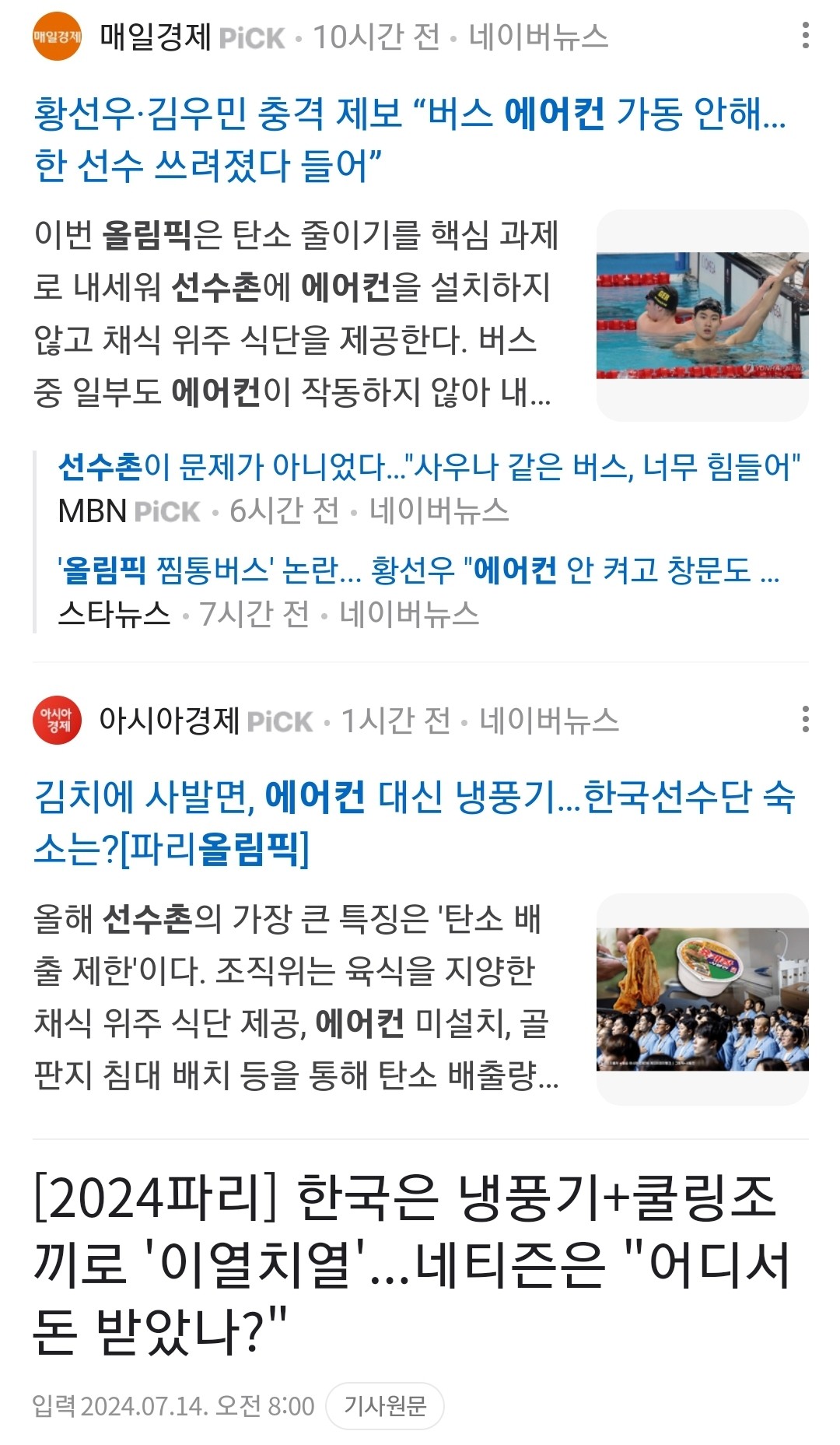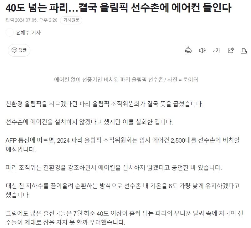 이거 정확히는 에어컨을 들인게 아니고 에어컨 설치를 허용한겁니다. 참가국에서 직접 들고가 설치해야하는데 우리 대표팀은 쿨링조끼 하나만 들고갔다네요. 그러니까 우리 대표팀 숙소엔 에어컨이 없다는거. 심지어 선수들 이동하는 버스에도 에어컨이 없어서 어느나라인지 몰라도 실신한 선수가 있더란 얘기를 수영선수들이 하더군요. | 24.07.26 17:01 | | |
