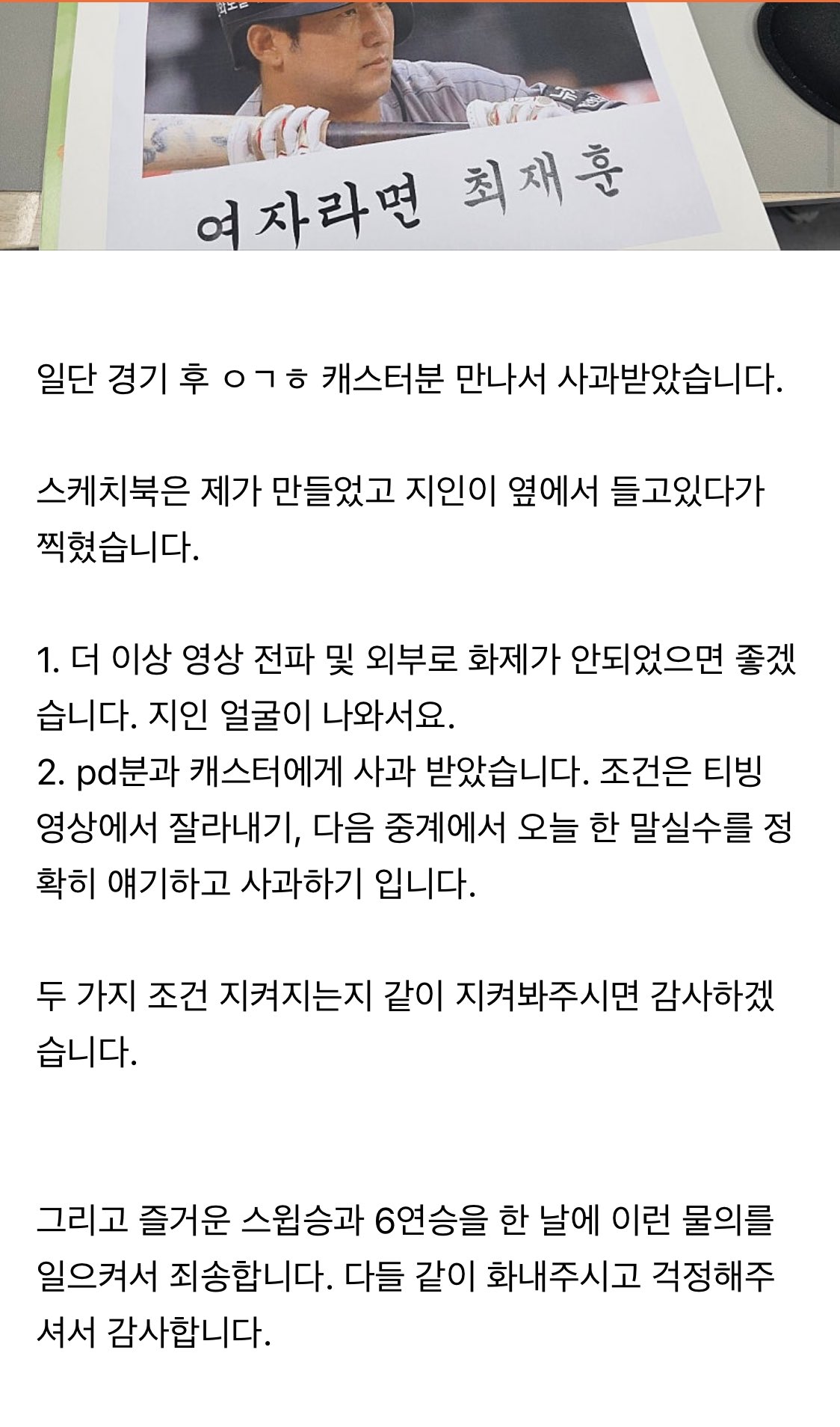 여자라면 최재훈 이라는 피켓을 들고 있는것에 아 여자라면 먹고싶네 하는건 말장난 섞은 그냥 성희롱이야 | 24.08.02 15:34 | | |