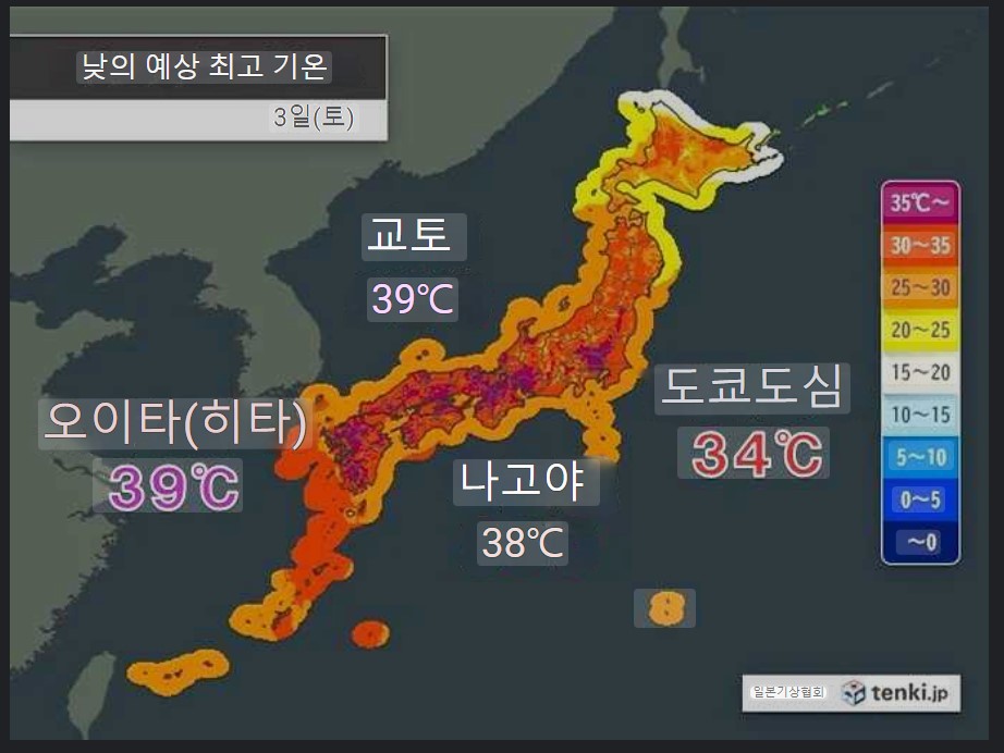 저건 고기압이 오사카-도쿄 사이 북쪽 어딘가에 있고 저기압이 도쿄 오사카 사이 남쪽 어딘가에 있어서 뜨거운 열기가 계속 도쿄 오사카 사이로 이동하고 있는 거임.