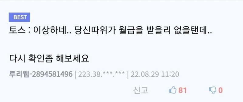 토스: 이따위게... 월급이라고????? | 24.08.03 05:47 | | |