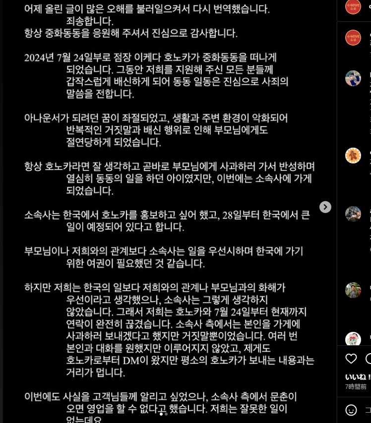 연예인이 되고 싶은 여학생? 여대생?이었는데, 할아버지가 운영하시던 중식당을 유언인지 평소 뜻이셨는지 물려받아서 운영함. *다른 글에서 본건데 가게에 위기도 있고 했지만 잘 극복해냈다고 함. 가게 sns에 한국어로 글이 올라왔는데 그거 사실과 다르다고 하고 오해하지 말아줬으면 좋겠다고 하는게 이번 글인듯 | 24.08.07 09:04 | | |