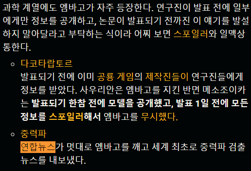 어그로도 어그로인데, 엠바고 안지킨적도 있음. ㅋ 전세계언론이 엠바고로 언제까지 중력파뉴스 보도 안하기로 했는데, 멋대로 전세계 언론 무시하고 중력파 검출 최초보도 했다고 함 ㅋ https://namu.wiki/w/%EC%97%A0%EB%B0%94%EA%B3%A0