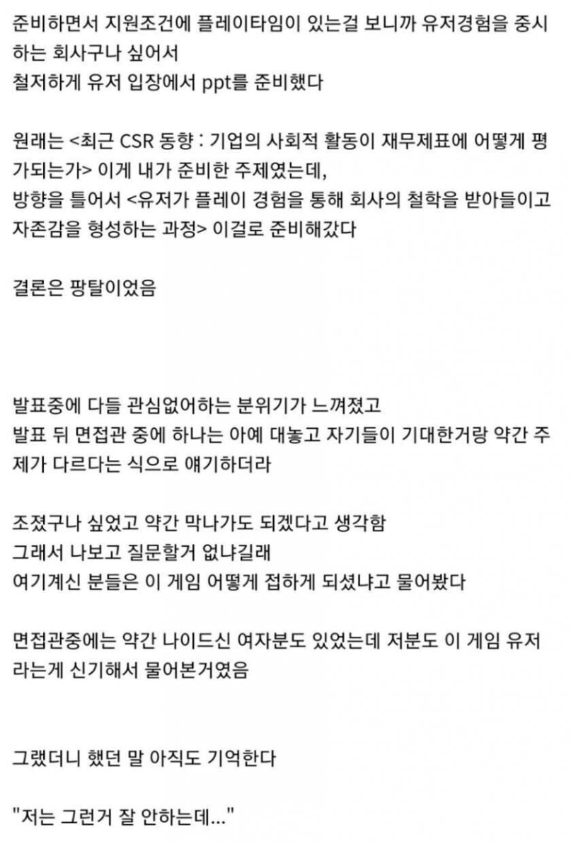 근데 원문글을 보면 경력직이라는데 대체 무슨 분야에 지원했길래 저런 내용의 ppt를 씀? 주제 선정부터 문제였던거 같은데? | 24.08.25 16:47 | | |