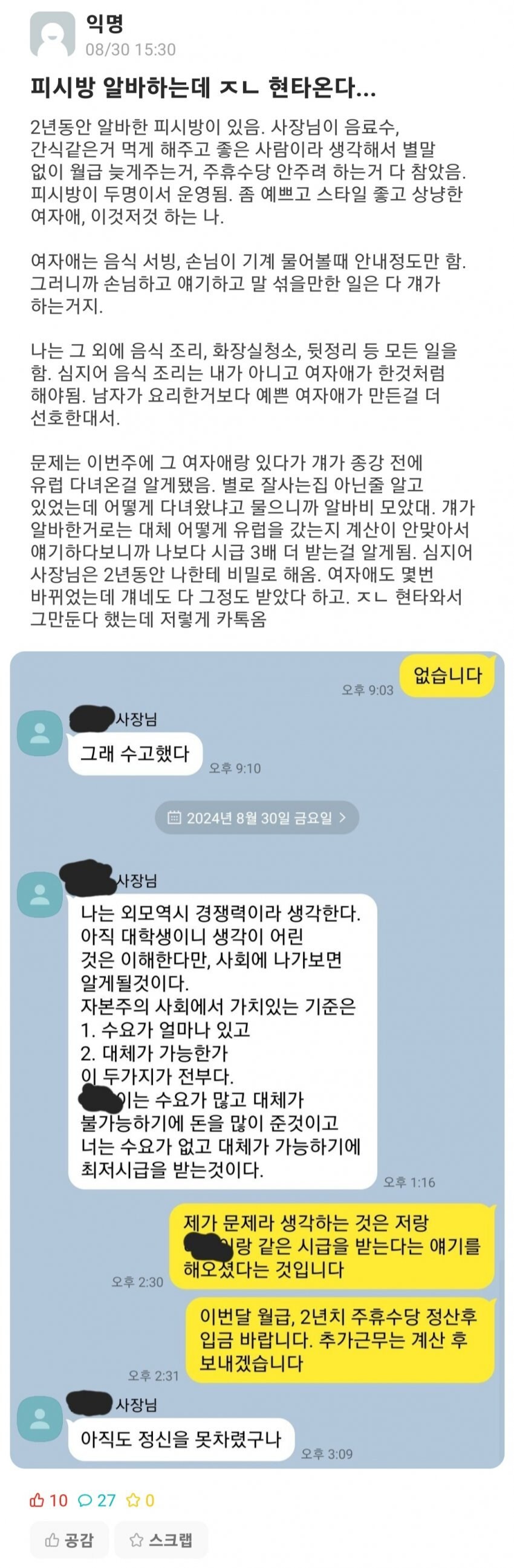 몰래 챙겨준건 그럴수있는데 짬은 다때려놓고 동일임금이라고 구라까지 친게 문제지 | 24.09.05 15:28 | | |