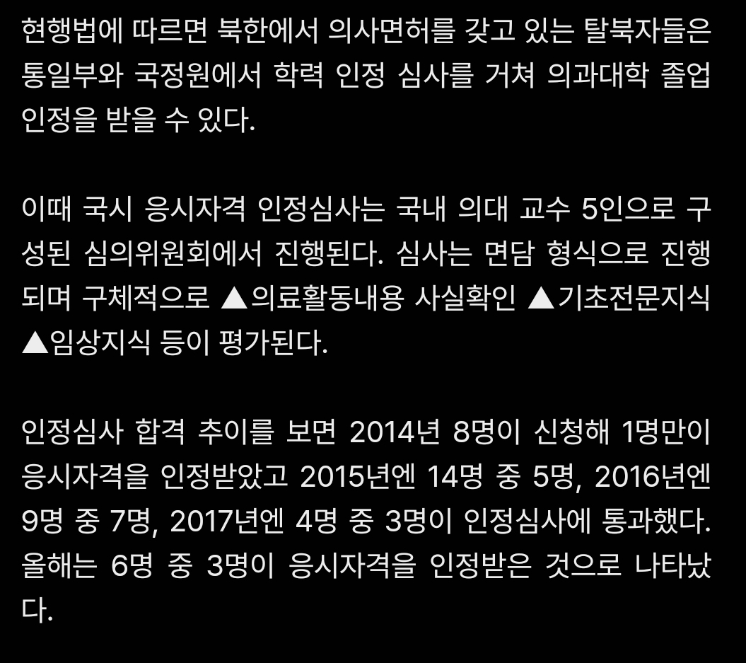 인정 안됨 북한에서 한의사하던 사람이 남한으로 탈북했는데 인정 안되서 한의사 공부 다시 했다고 함 | 24.09.06 08:55 | | |