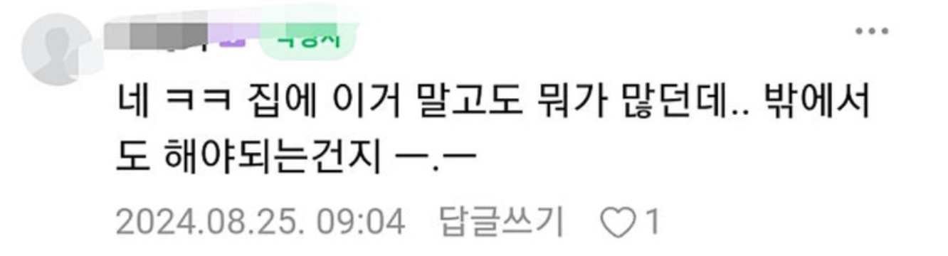 이거 말고 많은데 하는거 보니 그냥 진김 궁금해서 물어본것일수도.... 그냥 집 밖에서 까지 해야할정도 인가 의문을 가질수도 있는거고 | 24.09.06 10:14 | | |