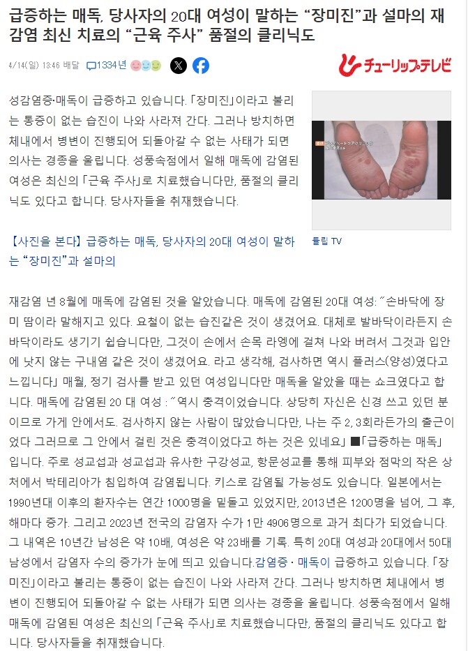 일본만 그런 게 아니라 우리나라도 매독 환자 증가세라던데 ㄷㄷ | 24.09.16 15:57 | | |