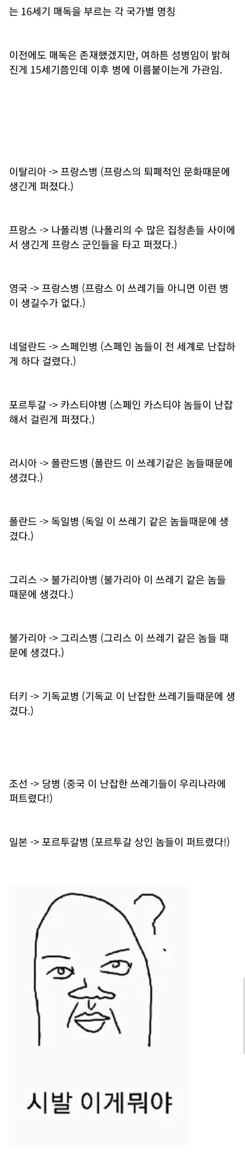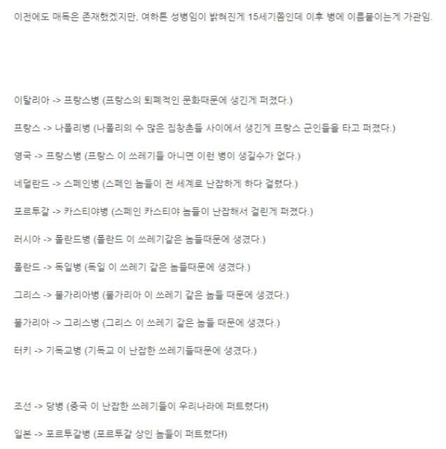 매독 네이밍의 역사도 참 볼만했지 각 나라들이 서로 니탓하는게ㅋㅋㅋㅋ