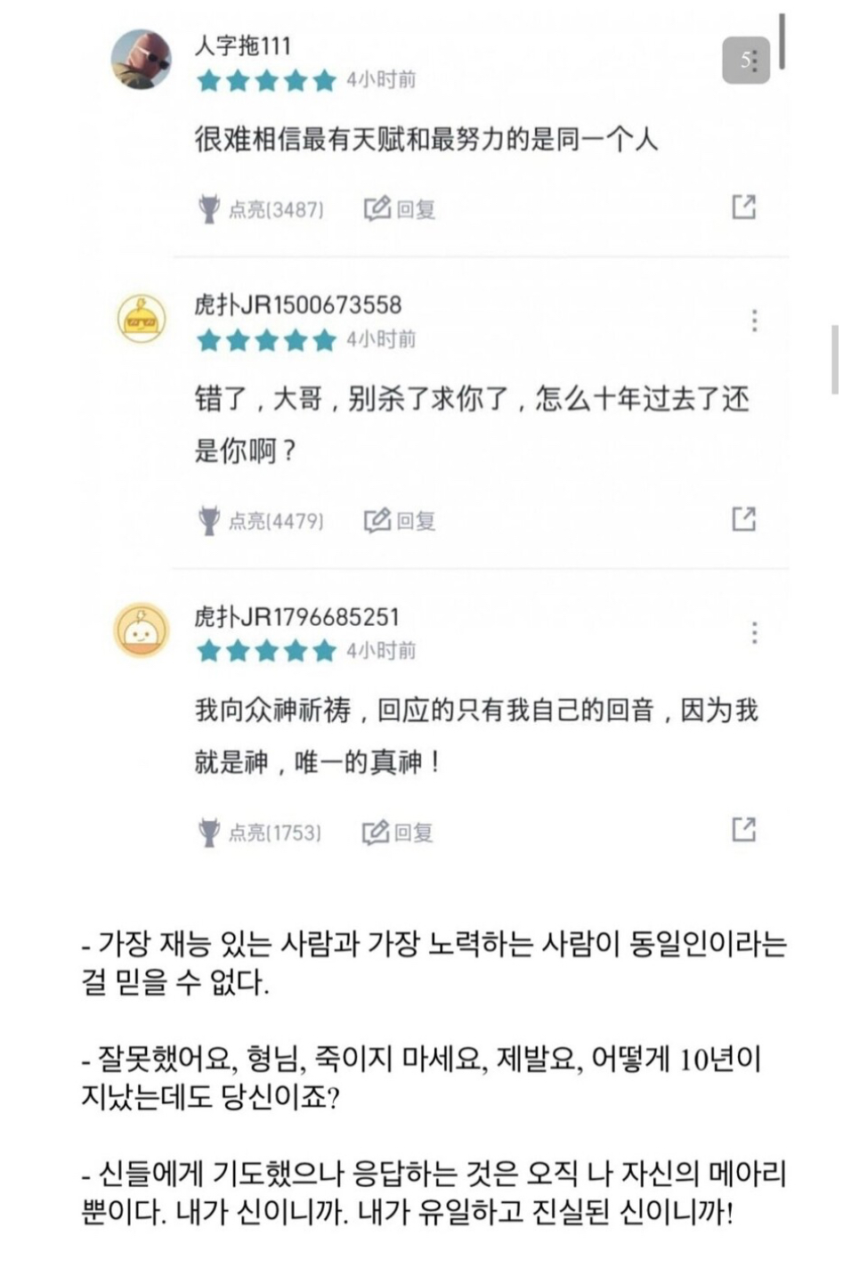 어떻게 10년이 지났는데도 당신이죠? 이 문장은 진짜 잊히질 않는다...ㅋㅋㅋㅋㅋㅋㅋㅋㅋㅋㅋㅋㅋㅋ 경외와 공포가 동시에 느껴지는 명문장... | 24.10.20 20:32 | | |