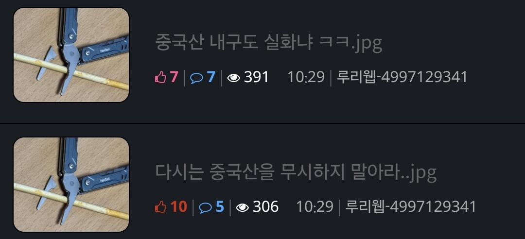 한쪽은 중국산 나무젓가락 찬양 한쪽은 중국제 멀티툴 까기