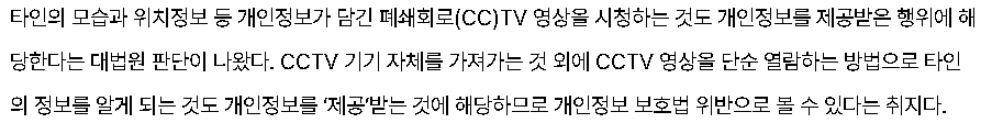 그런식이면 뉴스에 나오는 cctv 영상들은 다 불법임 니가 왜 우기는지 모르겠지만 CCTV 영상도 "보안팀이 범죄 의혹을 가지고 확인했다" 이러면 문제없고 개인정보도 모자이크 처리 잘해서 누구인지 알 수 없게만하면 무죄임 | 24.11.27 01:11 | | |