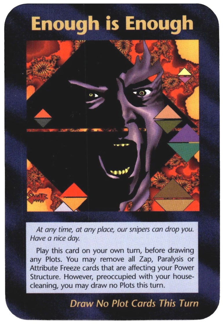 "At any time, at any place, our snipers can drop you. Have a nice day." "언제 어디서나 우리의 저격수들이 당신을 쓰러뜨릴 수 있습니다. 좋은 하루 되세요." 1994년에 나온 일루미나티카드다 정말 대단하지 않냐? 저거 말고도 코로나랑 9.11등 훗날 사건을 다룬 이미지들이 카드에 그려져 있다. | 25.01.27 07:38 | | |