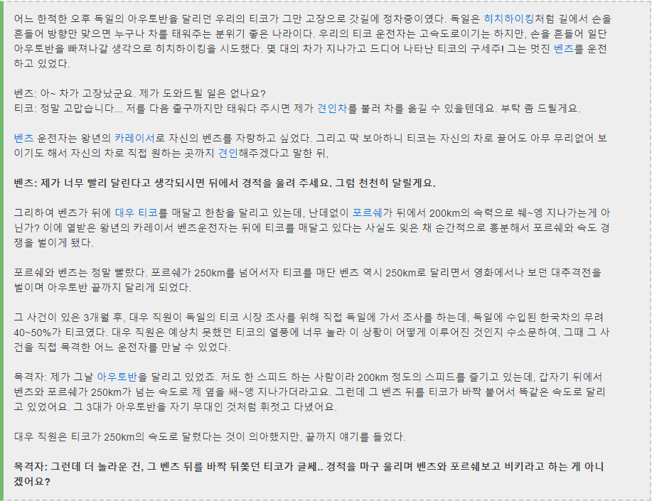 내가 말하는 건 고급 세단이나 슈퍼카 타는 놈들이 고작 티코 상대로 우월감 느끼고 싶었던 건지 빽점 놓고 사라지면 되는데 위험하게 추월하거나 끼어들어서 앞에서 알짱대는 놈들이 가끔.. 은 아니고 생각해보니까 은근히 자주 있었거든 그런 놈들이랑 신호 걸려서 나란히 섰다가 신호 바뀌고 출발하면 티코가 차체가 가벼워서 먼저 튀어나간다고 또 쫓아와서 끼어 들려나 싶어서 백미러로 체크하다 보면 시야에서 사라질 정도로 안 움직이는 경우도 진짜 어쩌다 가끔 한번 씩 있었다는 얘기야 당연히 티코 따위가 아둥바둥 해 봤자지.. 그거 모르는 사람 없어 마지막 줄에 써 놨잖아.. 얼마 못가서 다 잡힌다고 | 25.03.09 14:04 | | |