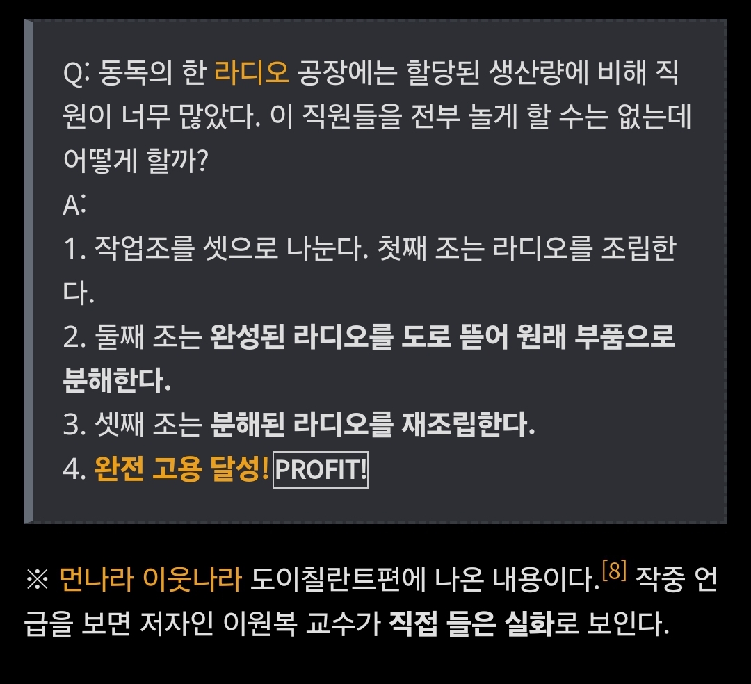 근데 다른 세계사/전쟁사/고대사등등을 다루는 방송류에서도 가끕 언급되는 이야기들 보면 "서양 공산주의 국가 종특"이었던거같음. 어떻게든 어거지로 일거리를 만들어서 "일단 지표상으로는 완전고용" 이루는거. 실용성이니 경제성이니 안따지는거지. 예를들어 식당같은데서도 손님이 메뉴 정하면 그걸 주방에 알리는데 서빙 직원 혼자서 듣고 알려주는게 아니라, 여러명의 사람들이 "XX!!" "XX랍니다!!" "XX라는데!!" 식으로 릴레이 전달을 하더라는... | 25.03.11 08:55 | | |