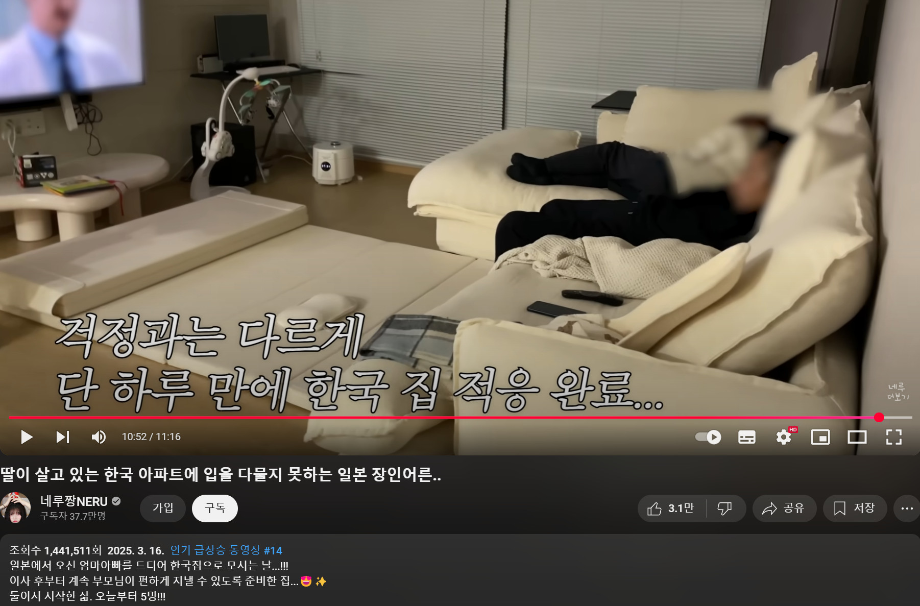 ㅇㅇ 네루짱 이라고 한일부부 한국에서 생활함 원래는 마누라 엿멕이기가 주 컨탠츠였는데 애 임신 및 출산 하면서 남편의 스윗(조롱아님)한 면모가 본격적으로 부각됨. 지금은 거진 출산 및 육아 유튜버... 를 가장한 마누라님의 먹방티비임 ㅋㅋㅋ | 25.03.19 17:50 | | |
