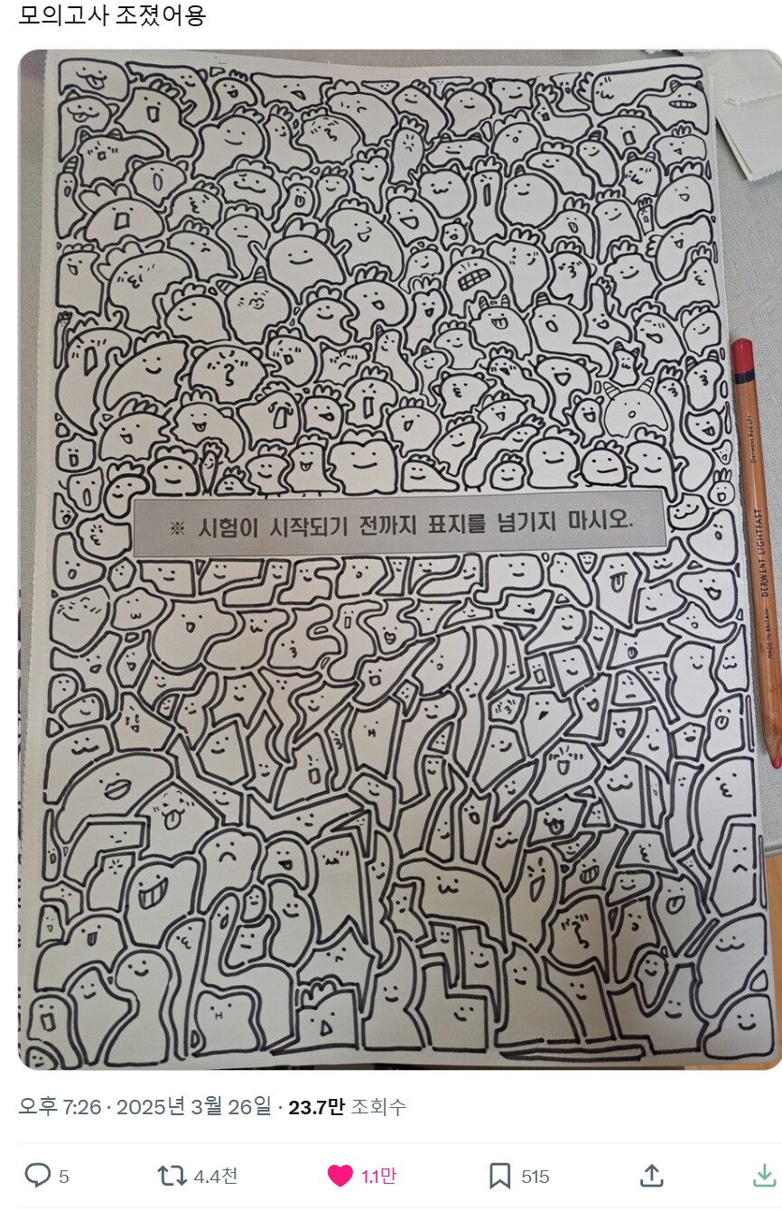 https://x.com/gurameramerame/status/1904819992576876857 어쩐지 트위터 탐라에 고퀄 시험지 낙서 막 올라오더라