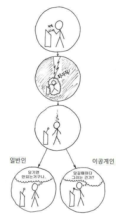 이과 마인드는 이 짤처럼 무언가의 원리와 발생 조건같은걸 본능적으로 궁금해해서 다른 사람들이 보기엔 바보같은 짓을 하는건데 저런 경우는 그냥 단순히 건전지가 쓴맛이 난다고 해서 진짜 혀로 핥아본 것 뿐인 1차원적인 행위니까 이과 마인드랑 전혀 상관없는 바보짓임 비슷한 경우로 거시기로 정말 알코올이 흡수되는지 궁금해서 이과두주 담가본 썰은 이과 마인드에서도 바보짓임 지 인체로 실험하는거고 진짜 알코올이 흡수될 때 어떤 결과가 나올지 뻔한데 처음부터 바로 이과두주같은 고도주에 담가버리는건 실험설계 측면에서 과학자 실격임