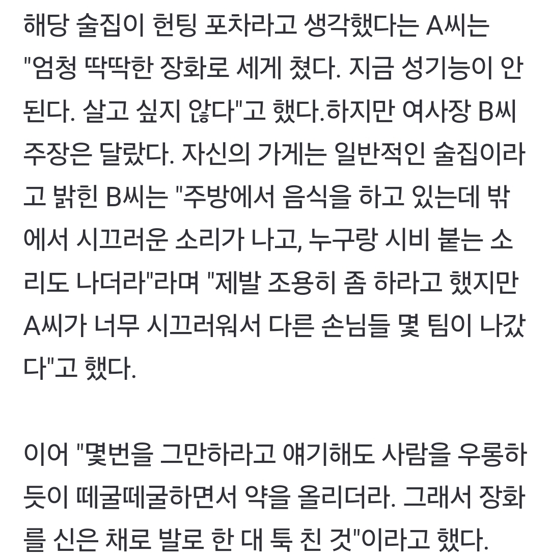 자세한건 나와봐야 알겠지만 저 영상만 봐도 처음에 '노래 크게 틀어놓고 춤추는 술집이였다' →아님 '성기능 문제로 심적 고통이 커' → 의학적인 소견을 들은건 아니지만 한쪽 말이 자꾸 바뀌네...... | 25.04.12 09:21 | | |