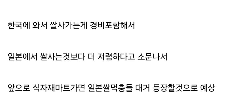근대 어찌되든 한국 원 으로 환전해서 마트에서 제값 치루고 사가는거라서 뭐 면세혜택 어쩌고 하기엔 어렵지않나? 쌀을 면세점에서 취급하는거도 아니고 말야 | 25.04.12 16:34 | | |