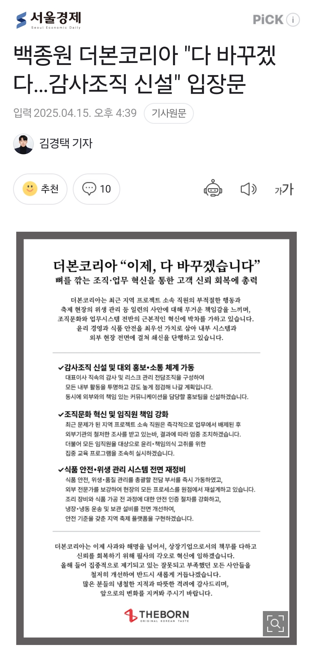 [유머] 백종원 더본코리아 "다 바꾸겠다…감사조직 신설" 입장문 [134]