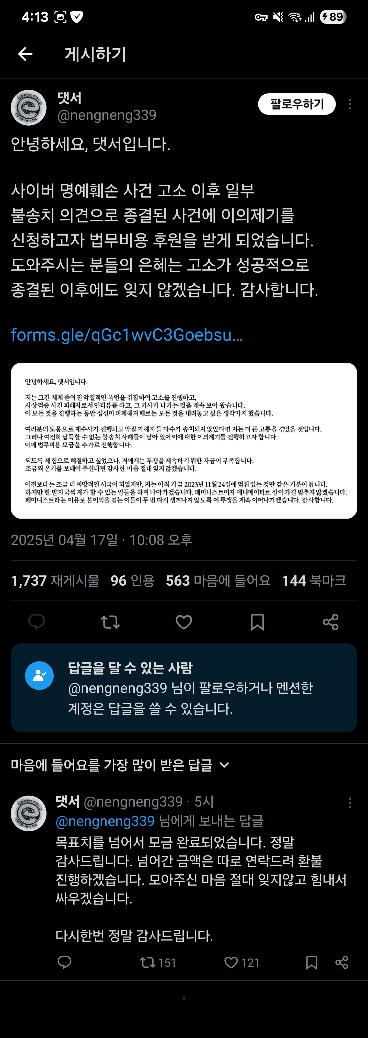 저 사람이 불송치로 끝났다는 거고 이제 욕한 사람들 전부 고소 하겠다는거 아님? | 25.04.18 16:20 | | |