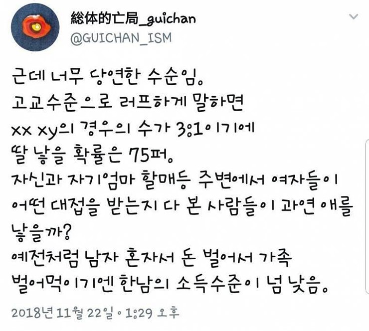 남녀차별 때문에 여자아이가 낙태를 많이 당해서.... 라고 믿고 있을걸 | 25.04.18 17:29 | | |