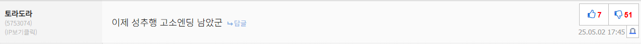 저 사람이 뭐 때문에 저러는지 몰라도 악의적으로 이런 댓글 다는 거는 선 넘는 거 아니냐..? | 25.05.02 17:49 | | |