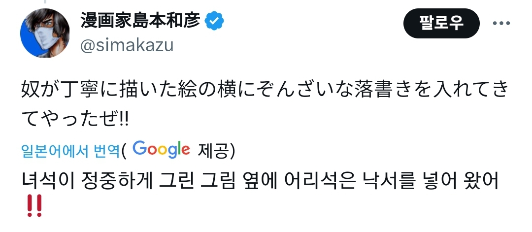 https://x.com/ufujitakazuhiro/status/1920342416357294438?s=46&t=KL-b_hH5TzIhGWxNckyRJw 후지타 선생의 답변: 뭐, 뭐 이딴 일이 다 있냐-앗! 내! 나의! 소중한 흑박물관 원화전이! 시마모토 카즈히코에게 낙서를 당하고 말았다고-옷!! (´༎ຶོρ༎ຶོ`) 일부러 굳이, 영상까지 찍어다 올리고 자빠졌어! 이자식 뭘 하러 온 거냐——! 이자식 뭘 하러 온 거냐고———!