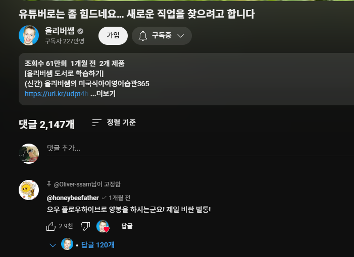 올리버샘은 구독자도 꽤 많고 조회수도 꽤 나오는거로 알고 있는데.. 유튜버로는 생활이 힘들다니.. 컨텐츠가 부족한건지 진짜 의외로 돈이 많이 안된건지 의외네요. | 25.06.13 18:00 | | |