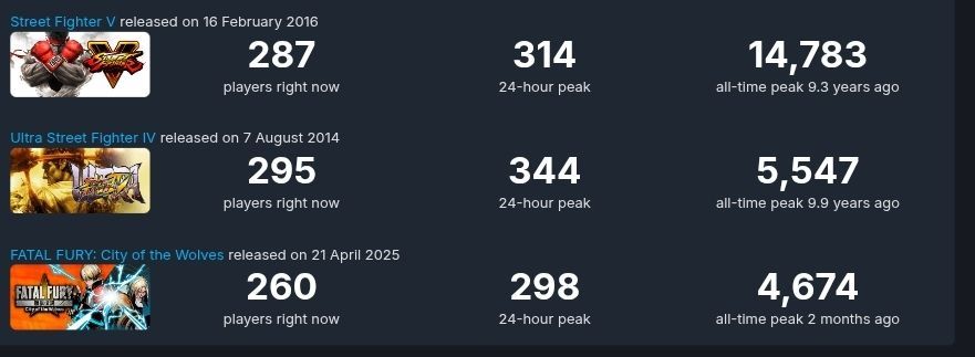 아래 표를 봤겠지만 그냥 스파6 이외에 격투게임은 다 죽었다고 보면됨 | 25.06.23 23:27 | | |