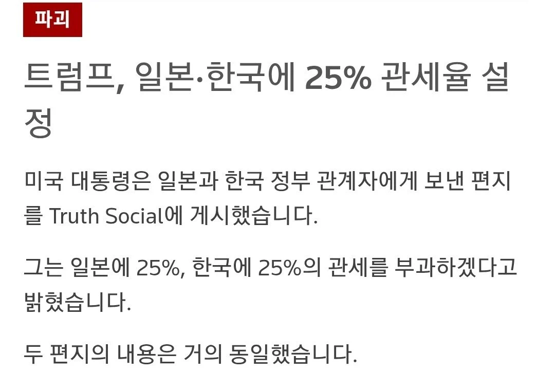 저게 기본관세고 품목별로 다르다함 철강이랑 자동차는 더 높음 그래서 8월1일까직 아직 더 유예기간 주고 협상중인셈 | 25.07.08 10:38 | | |