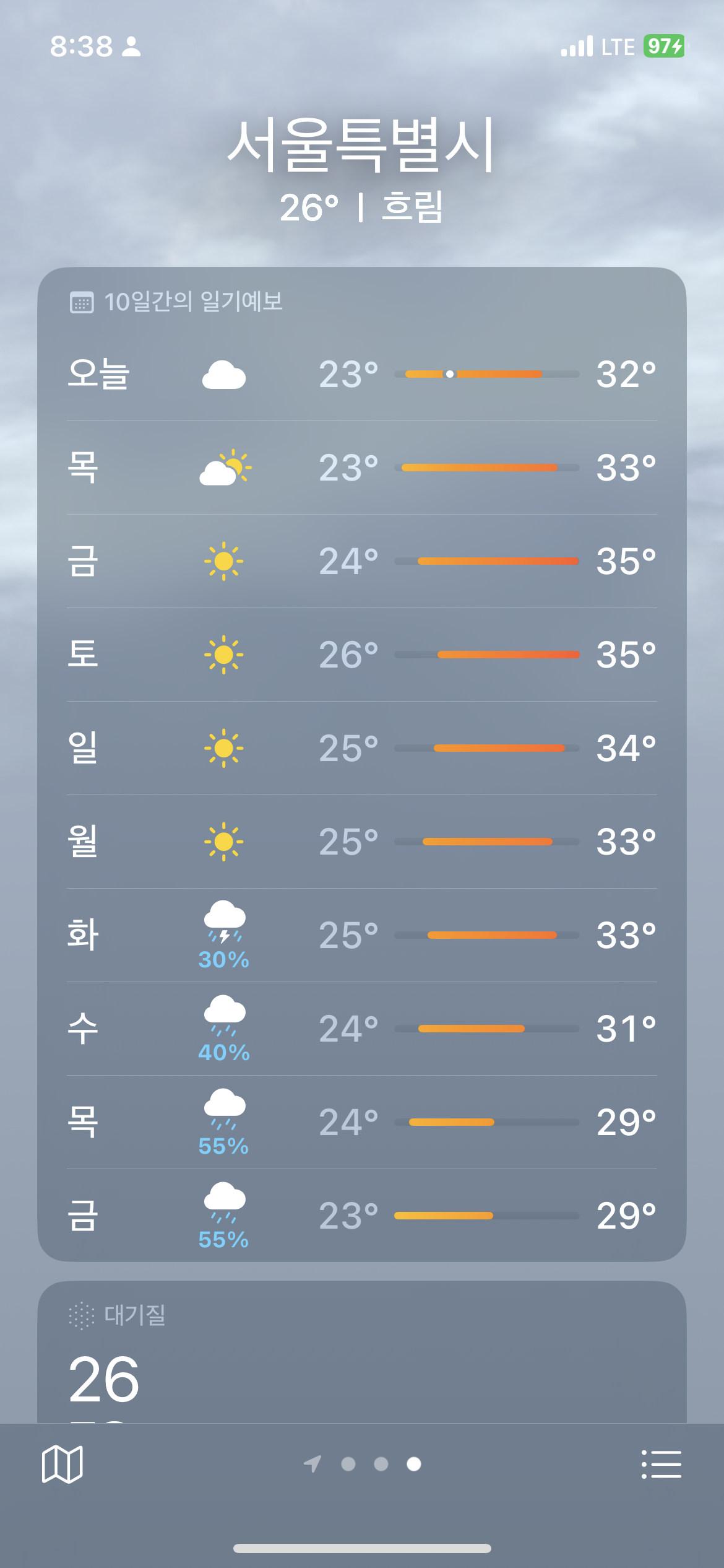 아니 뭐여 오늘도 36도 최고기온 예상이네 미쳤다 오늘은 재택이니 낮에는 하루종일 에어컨 틀어야겠네 | 25.07.23 08:37 | | |