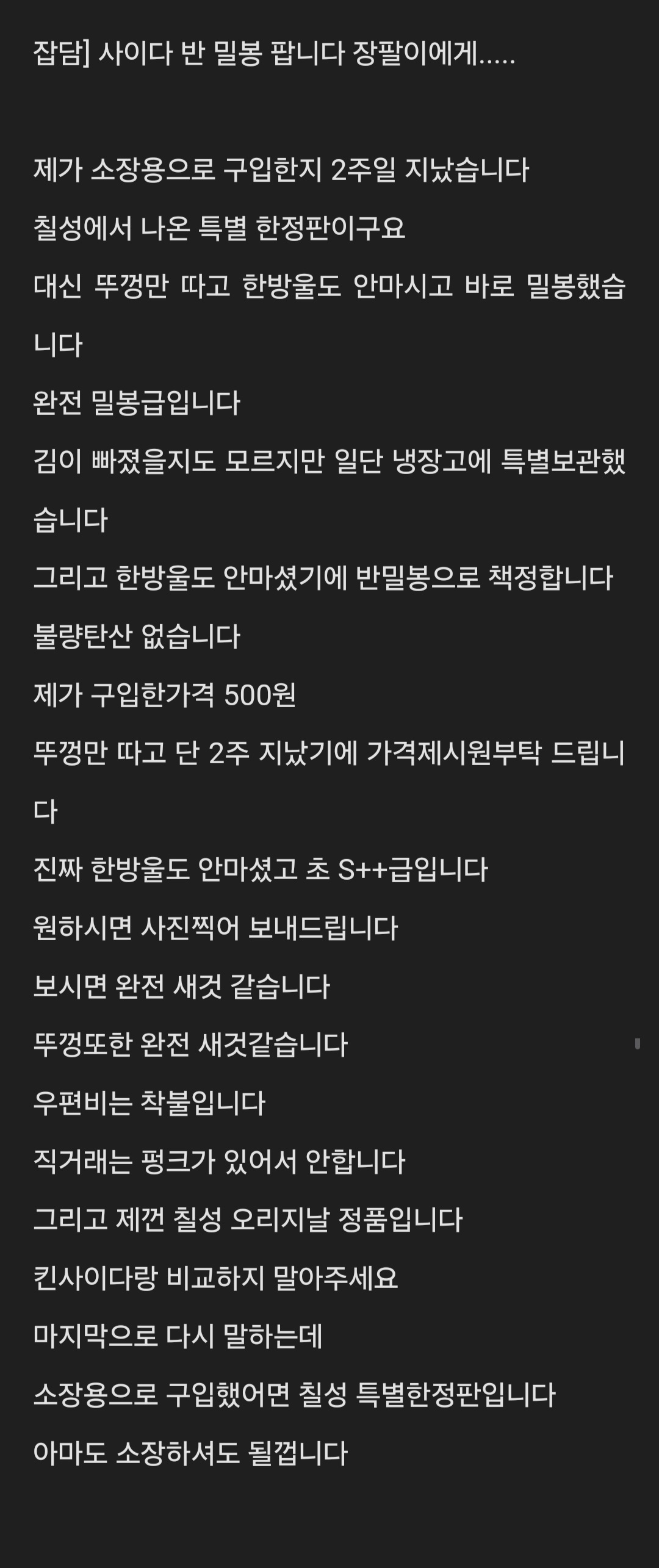 티안나게 살살뜯고 다시 비닐 포장한 '반밀봉'이라는 유래깊은 용어가 있단다. | 25.07.30 09:37 | | |