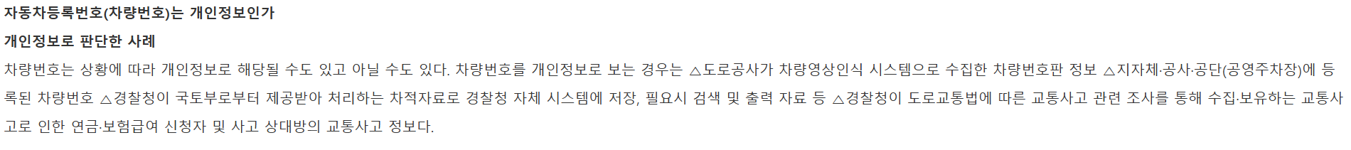 번호판은 개인 정보 아님. '번호판 + 연락처나 주소 같은 개인 특정 가능한 정보'일 때만 개인 정보로 성립. 개인적으로는 '민감할 수 있는 정보'라고 생각하긴 함