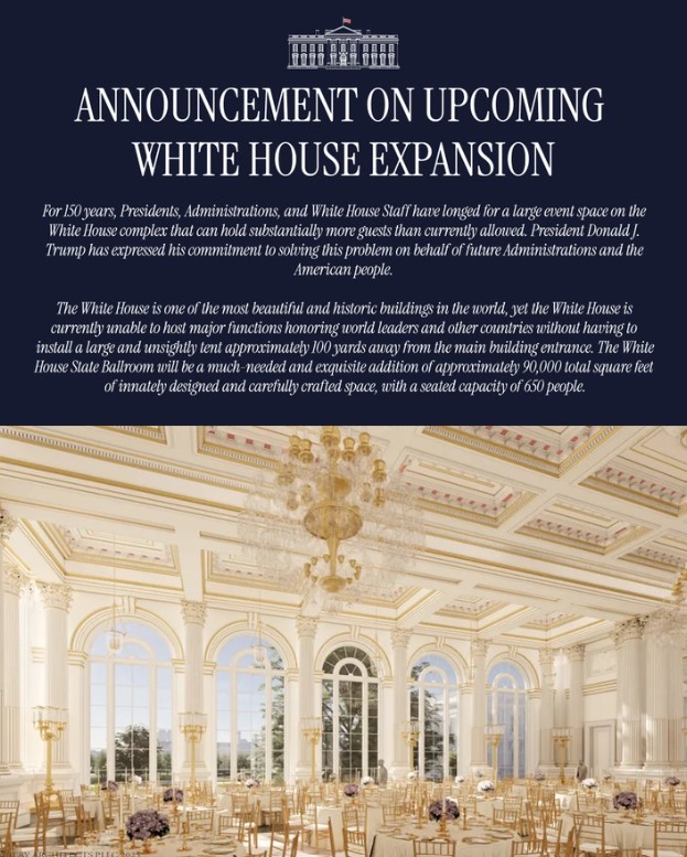 그냥 자기 멋대로 하는거임 이번에 650명 수용 가능한 고급 샹들리에가 달리는 거대한 대형 연회장 건설을 발표한 트럼프 | 25.08.04 16:56 | | |