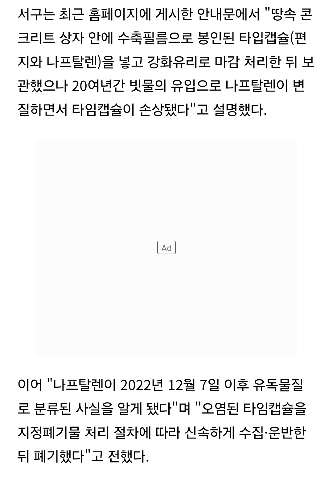 습기 방지용으로 나프탈렌을 넣었는데 이게 빗물 스며들면서 캡슐 안에 퍼짐+타임캡슐 만들 당시는 나프탈렌을 쓸 수 있었는데 열 때 되니 나프탈렌이 유독물질로 분류됨 | 25.08.05 16:38 | | |