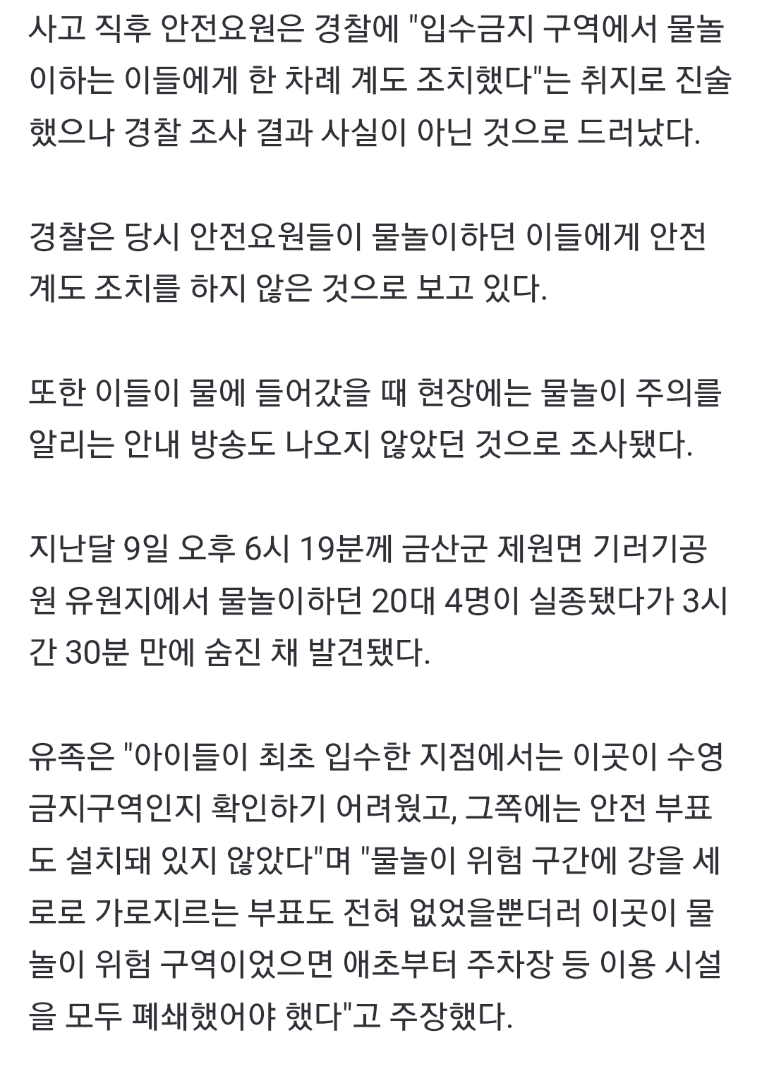 안전요원측 주장 : 우린 계도 조치 했다(근데 구라라는데) 사고 유가족측 주장 : 그런거 없었고 위험지역이라는 안내표지나 현수막도 없었기에 거기서 놀았다 위험지역이면 통제를 해야하는거 아니냐 대충 이거인듯 | 25.08.05 17:11 | | |