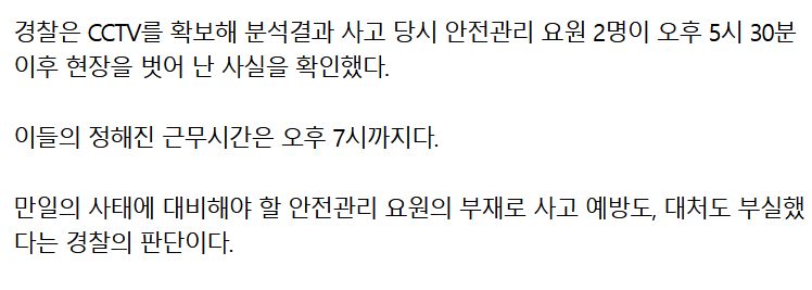 사고 당시 안전요원이 아예 없었음 CCTV 확인 결과 퇴근시간 한참 전인데 무단으로 근무지이탈한게 드러남 현장에 아예 없었으니 당연히 계도조치를 햇다는것도 거짓일수밖에 이 사건의 책임소재와 별개로 얘넨 큰일난듯 | 25.08.05 19:11 | | |
