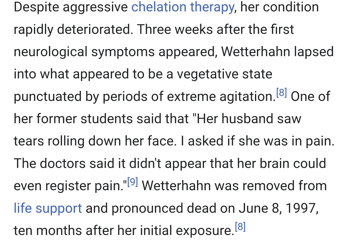 메틸수은도 제대로 못죽을 확률 엄청 큼 제일 잘 알려진 메틸수은중독 사례인데 혈중 수은 농도가 일반인 4000배가 넘어서 몇주동안 신체 기능 하나하나 정지되고 안죽고 식물인간되서 10달동안 고통받다가 결국 생명유지중단 결정으로 죽음 | 25.08.11 08:21 | | |