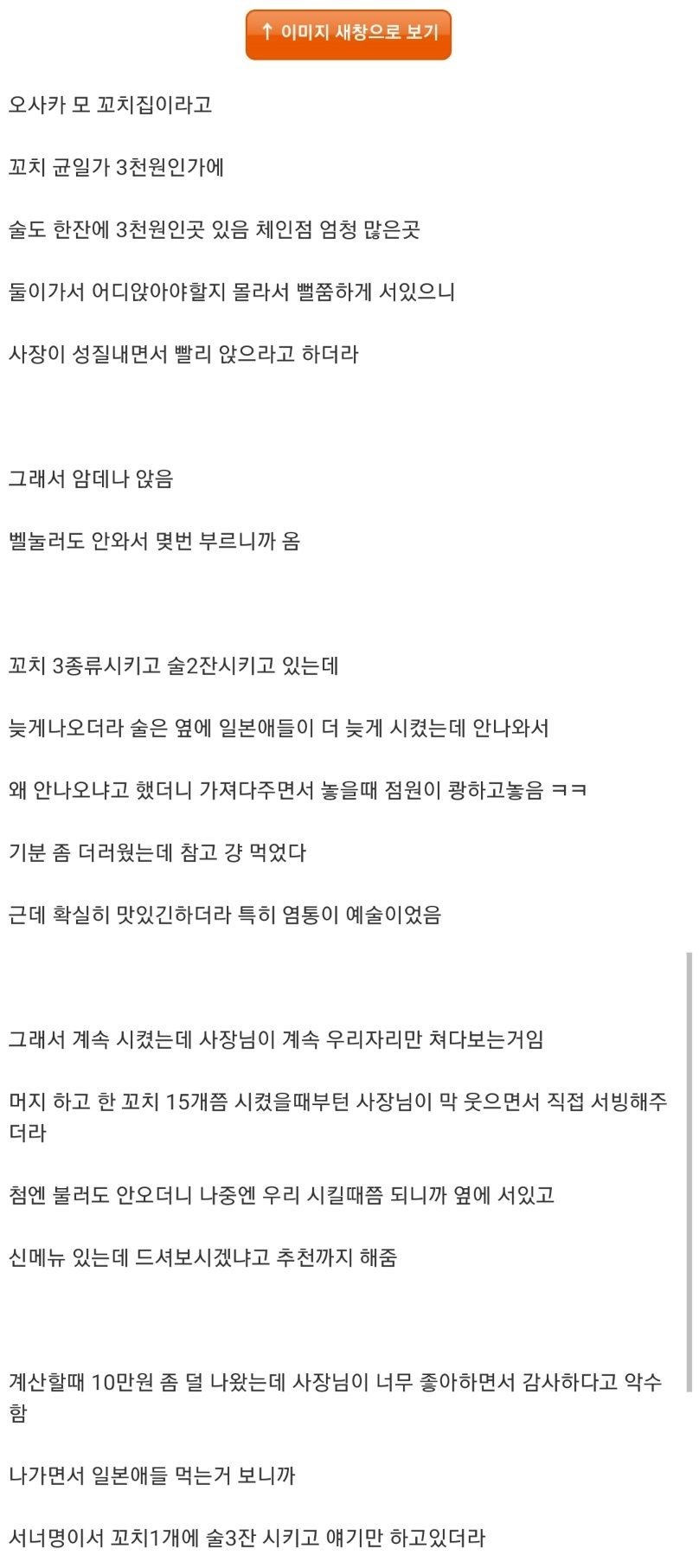 전에 오사카 놀러갔다가 유니버셜 스튜디오에서 씐나게 논다고 저녁을 못먹고 새벽까지 하는 술집에서 떼우기로 함 4명이서 안주 5개 정도 시키고 2명은 술 안마셔서 나랑 다른 한명이랑 500미리 생맥 8잔쯤 시키니까 사장이랑 직원이 엄청 친절하더라 | 25.08.15 18:03 | | |