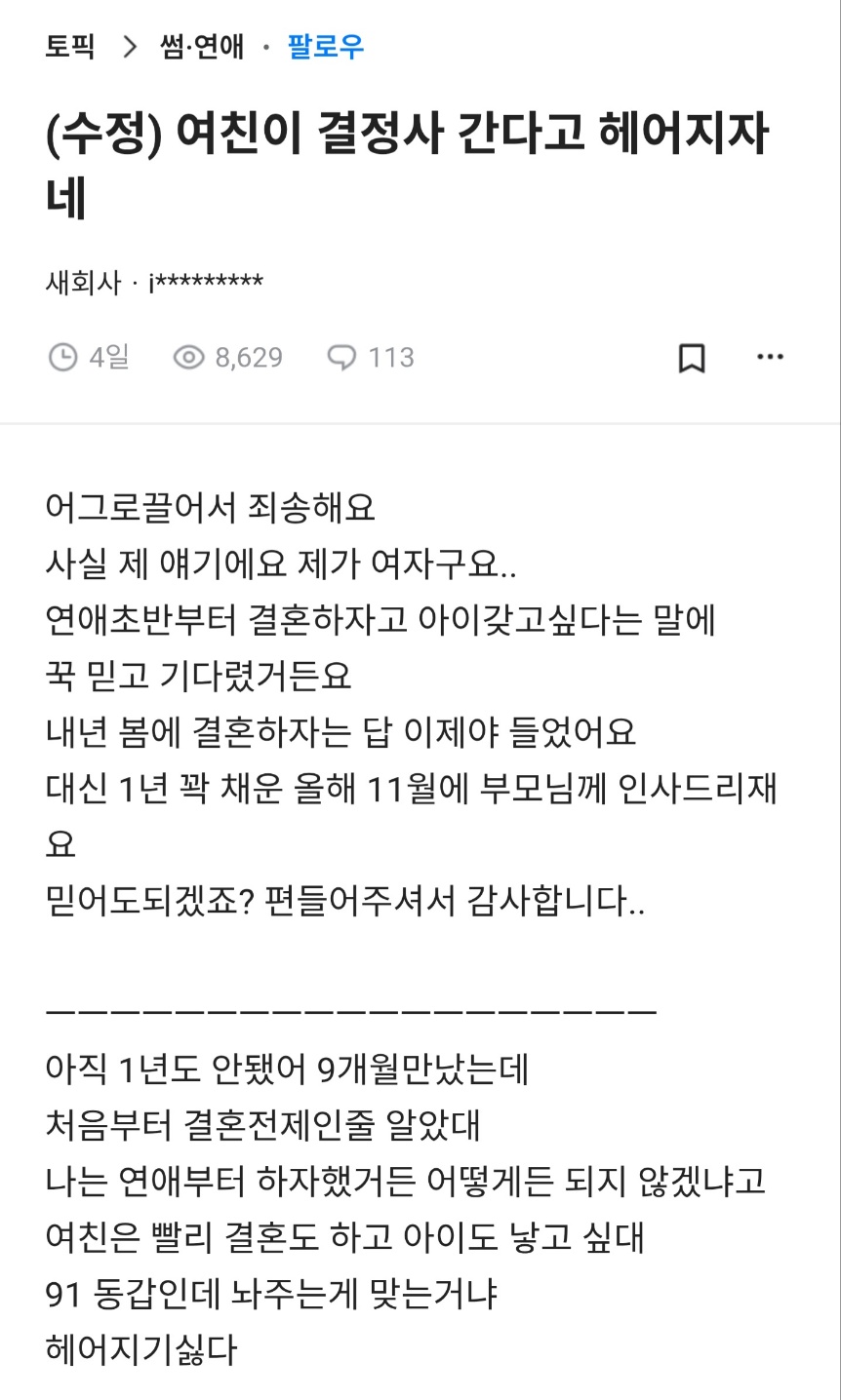 알았다 난 지금 바로 결혼은 아니다 헤어지자 좋은 사람 만나라 하면 남자가 잘못한게 전혀 없고 그냥 만나다 헤어지는 커플중 하나인데 글올리고 공감받으려하고 질질끌려는게 보여 욕먹을수도 있지 | 25.08.18 10:50 | | |