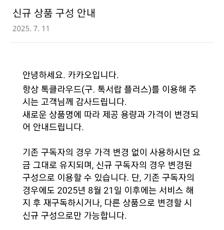 일단 기존에 쓰는 애들은 그 상품, 그 가격으로 유지는 해준데. 근데 약관 변경되면서 "기존 회원에게 변경 전 서비스를 제공"부분이 삭제되어서 언제든지 카카오 마음대로 강제로 변경될수는 있음. | 25.08.18 18:03 | | |