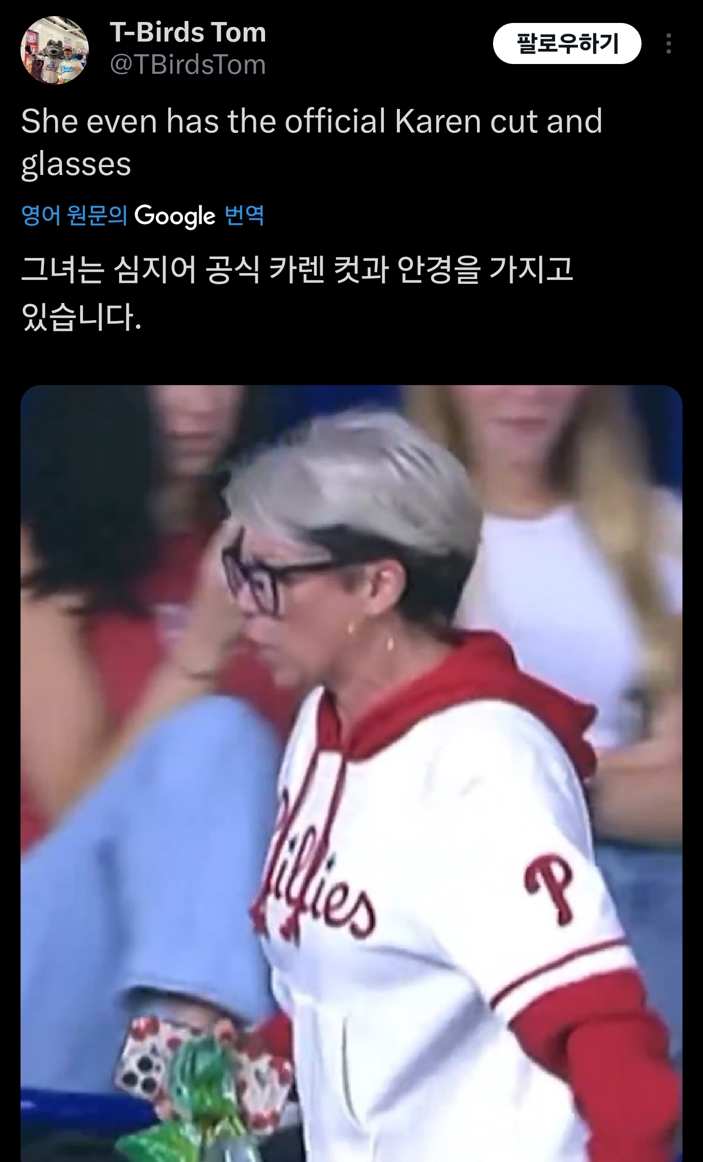 한국식으로 딱들어 맞는 호칭은 없는 거 같음. 김여사는 무개념 운전, 운전미숙 아줌마들을 칭하는 거고 ㅁㅊ은 아이 방패로 온갖 진상질 하는 30~40대 여자를 칭하는 거라 한국에서 딱맞는 멸칭은 없음. 애초에 4~60대 여성이 카렌인데 그 나잇대 한국 아줌마들은 억척스럽고 참견이나 관심이 심하지만 또 정도 많다라는 이미지라 아주 나쁘지는 않거든. | 25.09.07 04:49 | | |