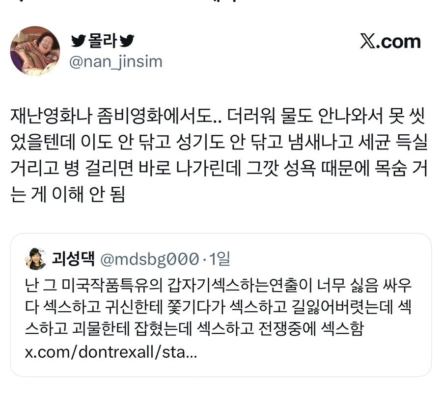 [유머] 재난영화에서 씻지도 않고 ㅅㅅ하는 연출이 싫은 사람.jpg [84]