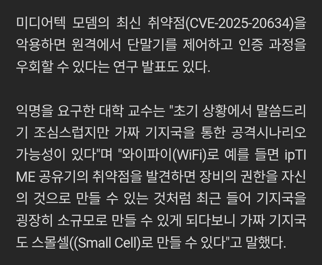 거기다가 이건 소프트웨어 해킹만으로 되는게 아니라 아예 물리적인 전자장비까지 설치해야 한다는 이야기인데... KT를 옹호하려는 것이 아니라 이건 좀 무서움... | 25.09.09 20:10 | | |