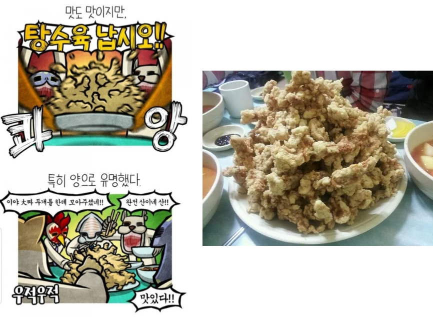 요즘은 모르겠는데 대학가나 대학생들 원룸같은데 이런 가성비 탕수육집이 많았음. 우리쪽은 호호탕수육이였는데 먹고 나면 입천장 다 까져있음 | 25.09.11 09:51 | | |