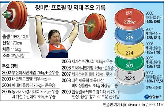 115kg 장미란 선수의 세계 기록은 남자 선수들은 67kg 체급에서 가볍게 뛰어넘는다...