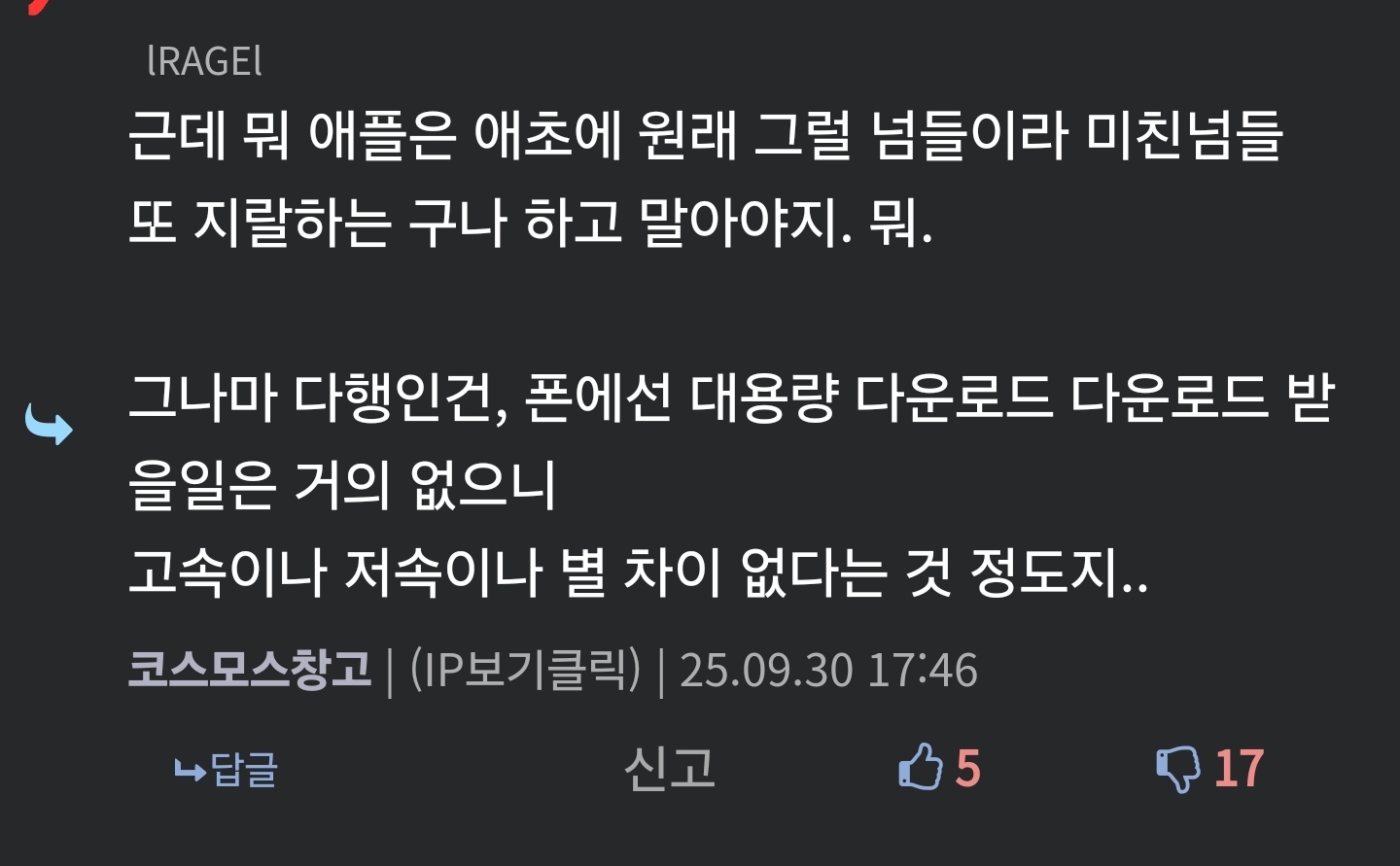 근데 뭐 애플은 애초에 원래 그럴 넘들이라 미친넘들 또 지랄하는 구나 하고 말아야지. 뭐. 그나마 다행인건, 폰에선 대용량 다운로드 다운로드 받을일은 거의 없으니 고속이나 저속이나 별 차이 없다는 것 정도지.. | 25.09.30 17:46 | | |