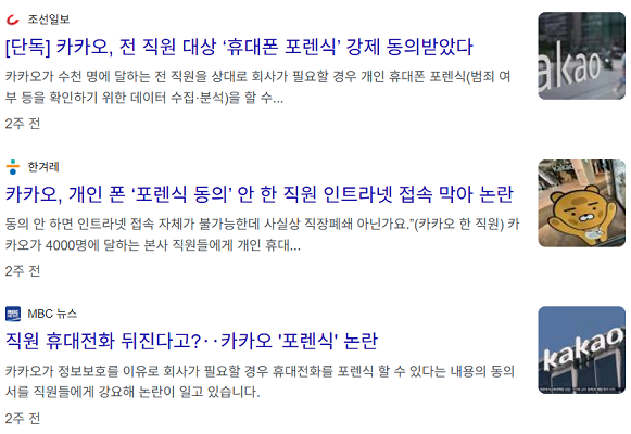 뭐 이유는 회사 주요 개발 정보 빼간다고 의심될때 보겠다는 건데, 개 오바지.. 내가 전에도 썼지만, 저럴 것같으면 차라리 출근 시간에 휴대전화를 아예 못쓰도록 하고, 출입구에 휴대전화 케비넷 만들어서 거기다 다 보관하도록 하는게 낫지. | 25.10.01 17:01 | | |