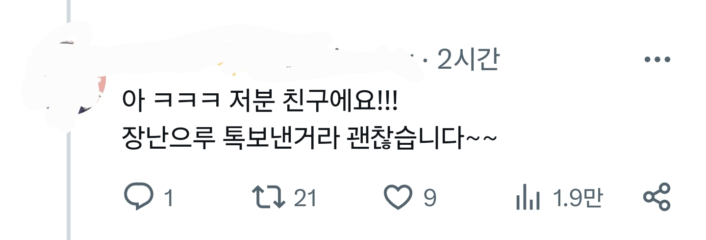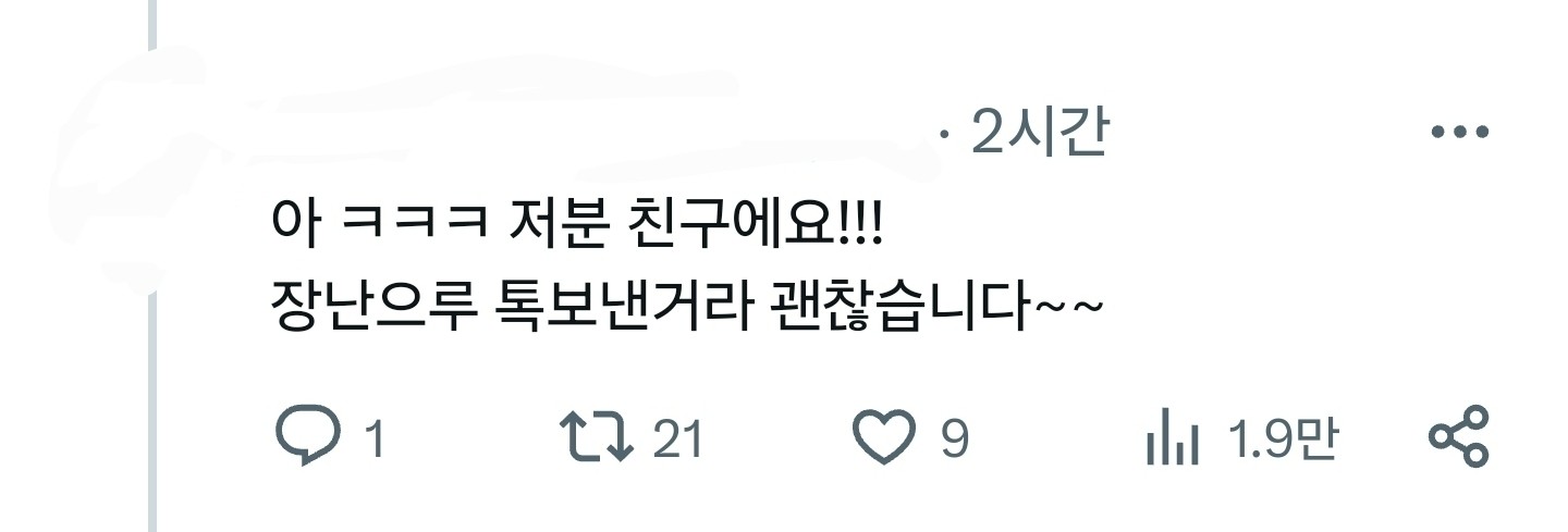 찾아보니 친구랑 장난친거라고 함 ㅋㅋㅋㅋㅋㅋㅋㅋㅋㅋㅋㅋ | 25.10.02 17:12 | | |